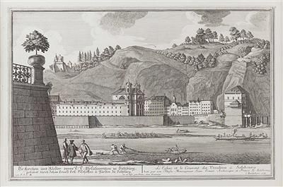 | Ansicht der Ursulinenkirche in Salzburg, mit Mönchsberg und Schiffszug | |