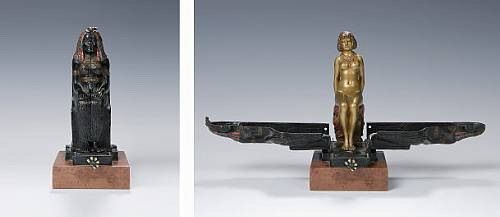 A cold painted bronze metamorphic figure of a seated female Pharaoh