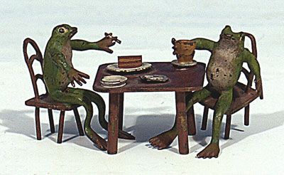 Skulpturengruppe,dreiteilig: 2 sitzende Frösche am gedeckten Tisch.