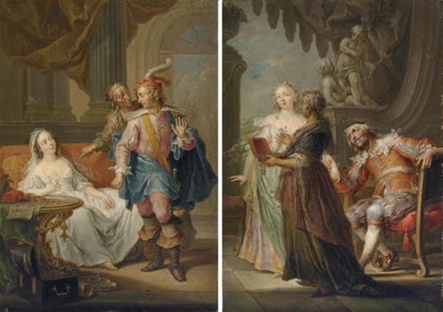 | An elegant couple with an old maid in an interior; and An elegant couple with an old maid in an exterior | |