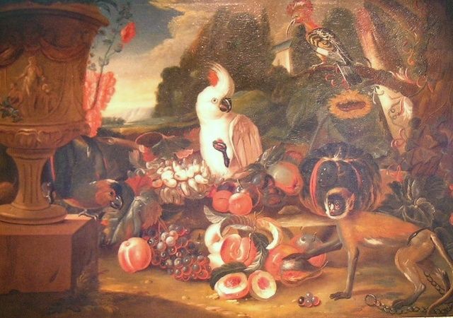 | COCKATOO, PARROT AND OTHER BIRDS AND A GIBBON ON A CHAIN WITH GRAPES, PEACHES, PLUMS, AND OTHER FRUITS IN A PARK SETTING | |