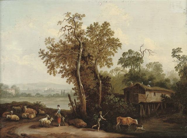 | A wooded river landscape with a shepherd and shepherdess with their flock and cattle | |