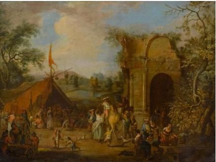 | Travellers resting and traders in a landscape with ruins. | |