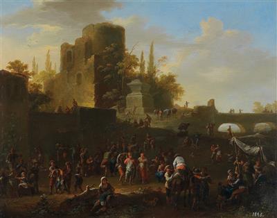 | An Italianate landscape with numerous figures by a ruin and a bridge in the background | |
