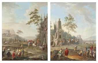 | A landscape with travellers conversing near a classical monument, a bridge beyond | |