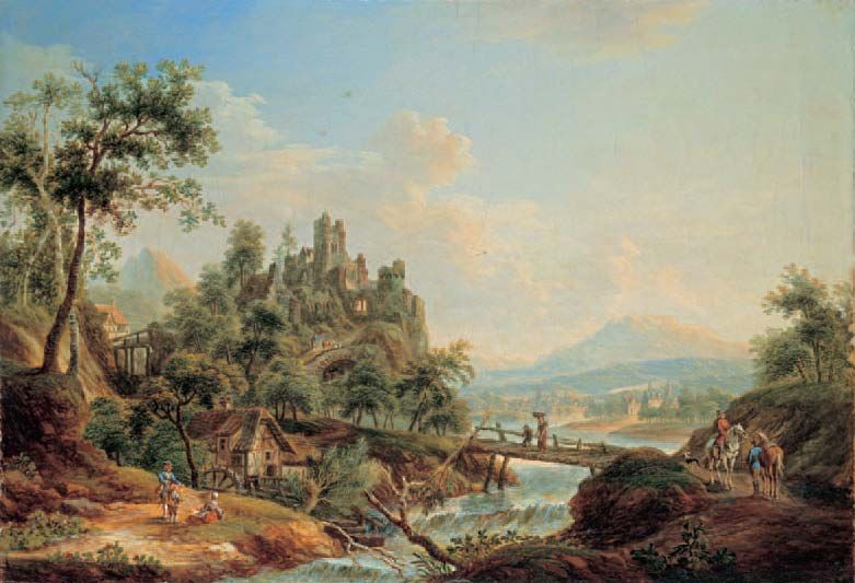 | FLUSSLANDSCHAFT MIT EINER GROSSEN BURGRUINE UND EINER MÜHLE DAVOR, RECHTS VOM STEG ZWEI REITER UND WEITBLICK | |