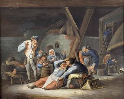 | Bauerninterieur mit Liebesszenen und Personen an offenem Feuer | |