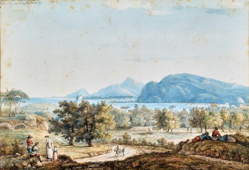 Weite Landschaft am Meer mit Staffagefiguren.