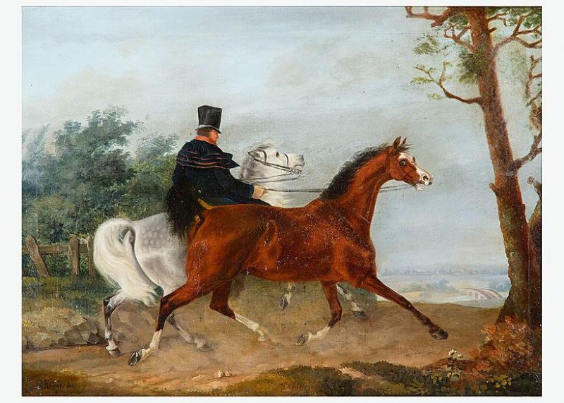 | Pferdeknecht auf Apfelschimmel, einen feurigen Braunen am Zügel führend | |
