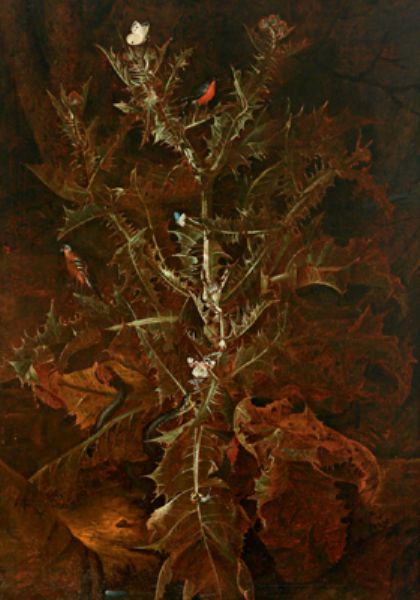 | Still life with a thistle, a bullfinch, a thistle finch, and butterflies, including a large garden white, a blue, and a painted | |