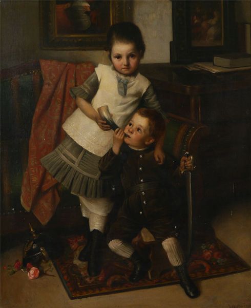 | Brother and Sister in an interior, playing with grandfather's military items; sword, pickelhaube, and powder horn | |