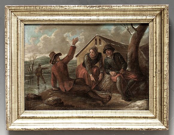 Vor einem Haus rastende Schlittschuhläufer an zugefrorenem See
