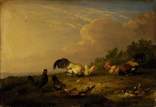 Twee hanen, kippen en twee eenden op een heuvel in een landschap
