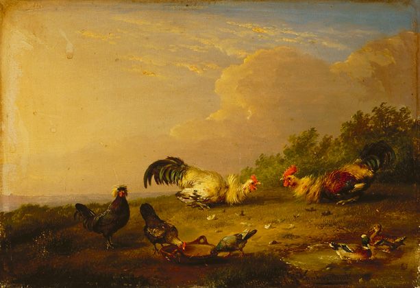 | Two cocks, chickens and two ducks on a hill in a landscape | |
