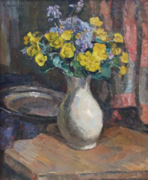 Blumenstilleben mit Vase und Silberplatte auf dem Tisch