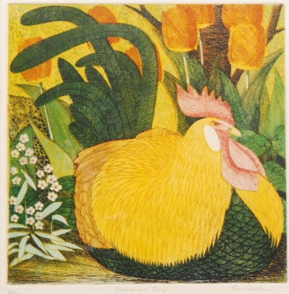 Cockerel and Tulips depicting a resting Cockerel amongst a flower bed