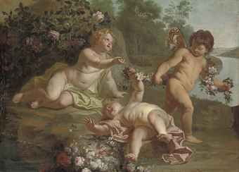 | Putti disporting with garlands of flowers beside a lake | |