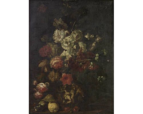 | Roses, carnations, peonies and other flowers in an antique urn, on a table top, with a lemon and prunes | |