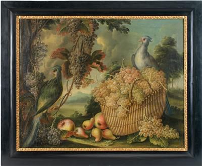 Stillleben mit Vögel, Trauben-korb und Früchten