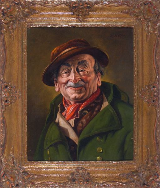 Portrait eines verschmitzt lächelnden Bauern mit Hut, Brustbild en face