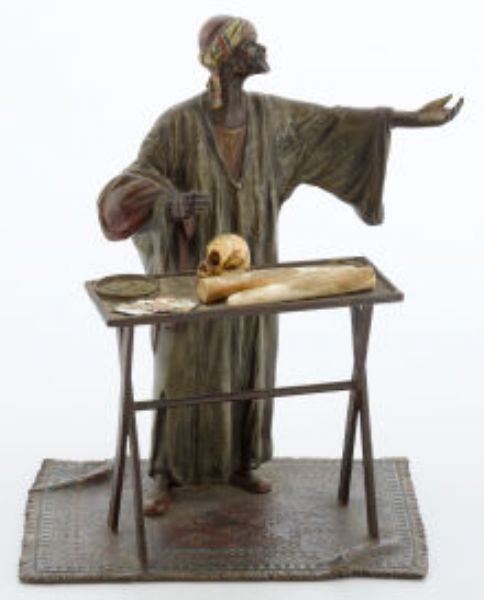 ROBED FORTUNE TELLER UPON A RUG BEFORE HIS TABLE