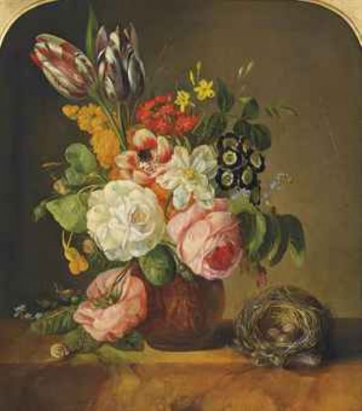 | Roses, tulips, forget-me-nots, nasturtiums, jasmine, anenomes and other summer blooms in a classical urn by a snail and a bird's | |