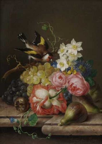Stillleben mit Blumen, Weintrauben, Feigen und Distelfink.