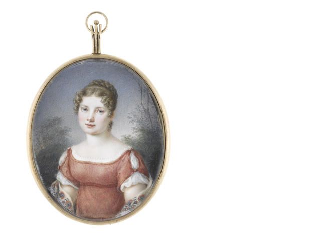 | A Lady, seated before a landscape and wearing red dress over white chemise, her ivory stole draped about her and embroidered wit | |