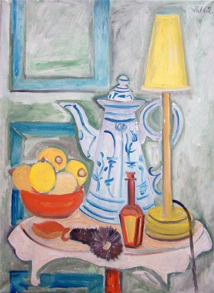Stillleben mit Zitronen, Kanne und Lampe auf Tisch arrangiert