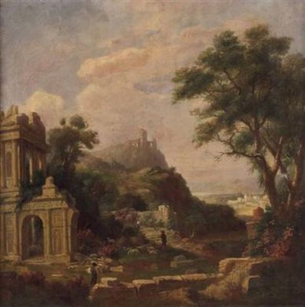 Südliche Landschaft mit antiken Ruinen und Personenstaffage