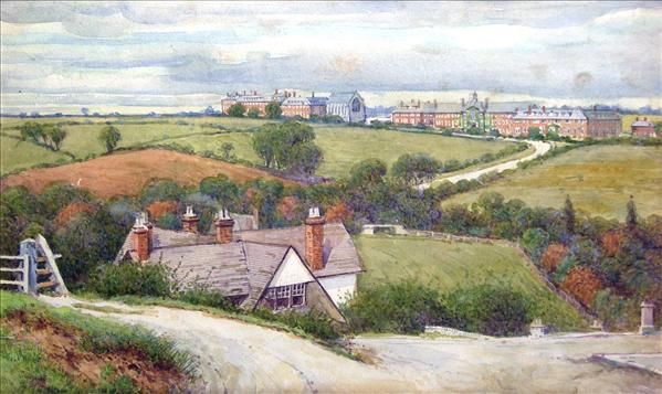 A View From The Hill, summer landscape with chapel and buildings beyond