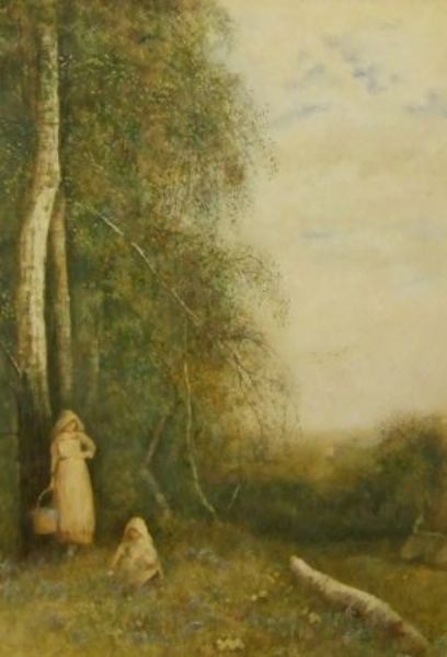 Mother and Child Gathering Bluebells at the Edge of a Wood
