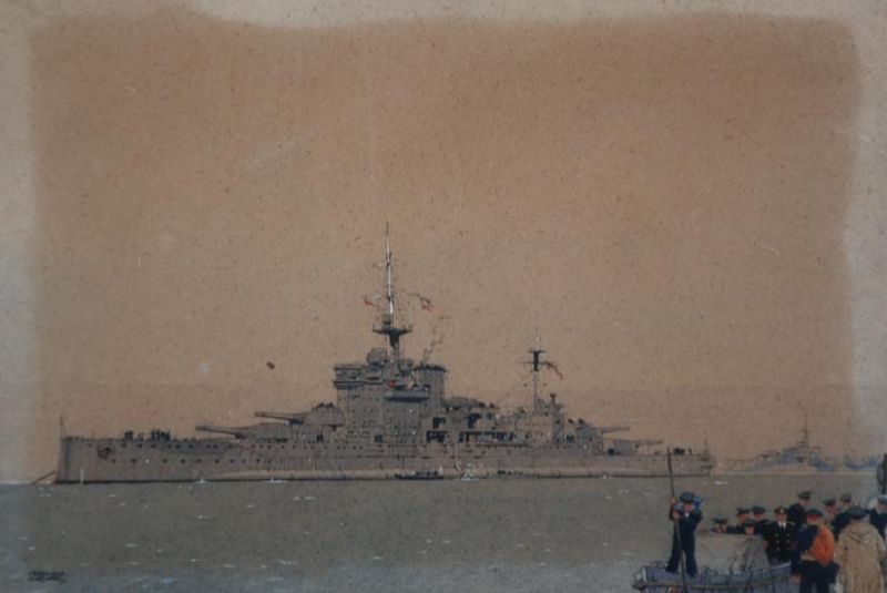 | Battleship HMS Warspite, the detailed depiction after D-Day, Brest, Le Havre, Walchren Isle with navel figures on the quayside l | |