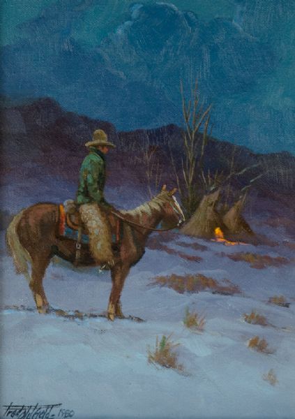 | Winter camp, a man on horseback near teepees at night in the snow. | |