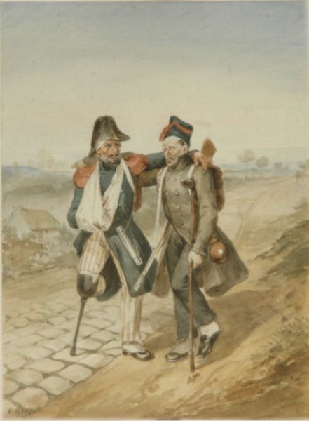 Two Napoleonic wounded soldiers supporting each other on a country road
