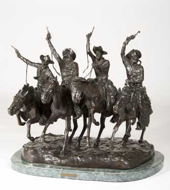 Bronze casting showing four cowboys riding next to eachother supported by an oval marble base, marked in the casting "Copyright Frederic Remington, 15/100" lower right side, base 29" x 21" height overall 26 1/2", bronze 25" wide. | |