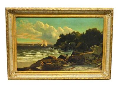 | depicts seascape with figures walking a long a rocky shore, sailboats dot the horizon, blue sky with fluffy clouds edged by rece | |