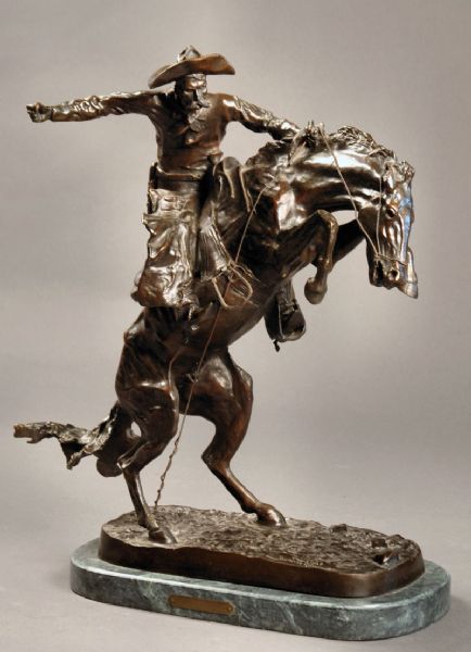 | Bronco Buster - A cowboy riding a rearing horse, on green veined marble rectangular base | |