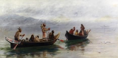 INDIANS PADDLING WEST COAST CANOES