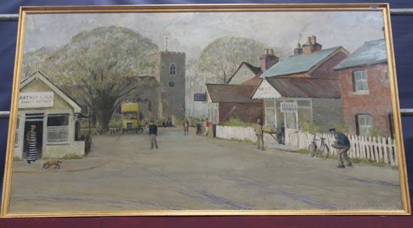 | view of West Mersea, looking towards the church, with figures and a yellow bus | |