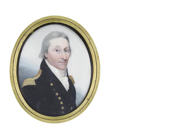 | Captain Jonas Rose (1758-1821), wearing double-breasted blue coat with gold epaulettes, white waistcoat, frilled chemise and sto | |