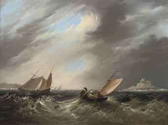 | Fishing luggers in a heavy swell off St Michael's Mount, Cornwall | |