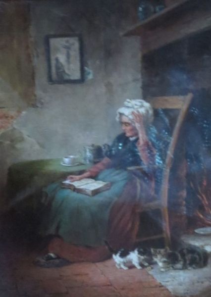 | A man and canine companion sat by a fire A old woman reading with cats by a fire | |