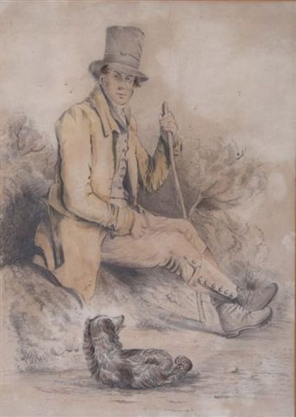 A gentleman wearing a top hat, seated at a wayside with a dog by his side