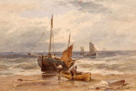 | Coastal View with Fishermen by their Boats, further Boats in Distance | |
