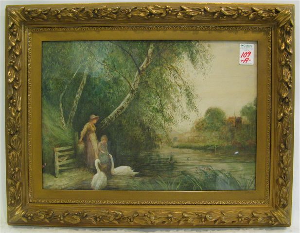 | Landscape with mother and daughter feeding swan along placid stream | |