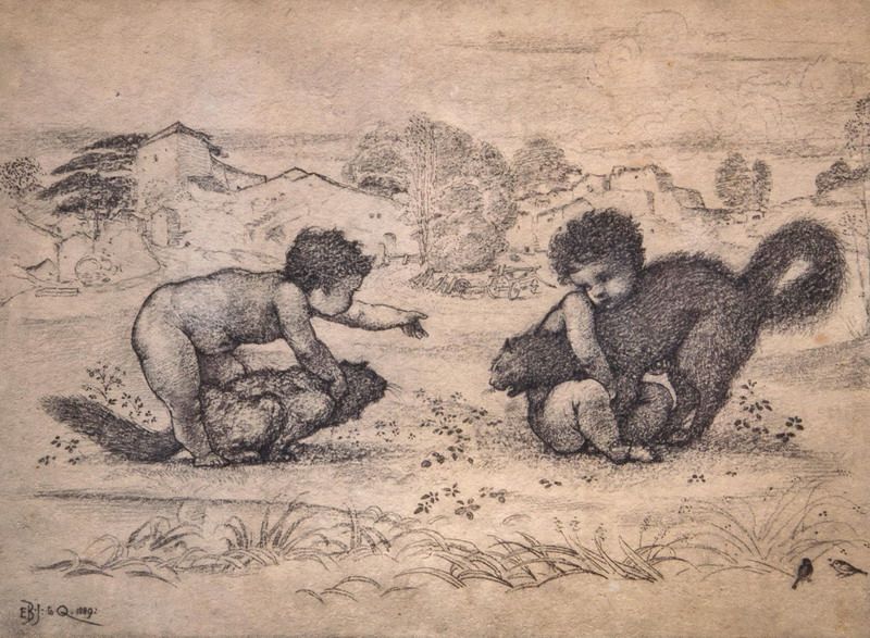 Fighting cats restrained by two naked children in an Italianate landscape