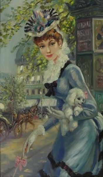 French street scene with elegant young lady carrying small pet dog