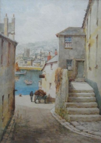 View through cottages to harbour, probably St Ives with figure and cart on quayside