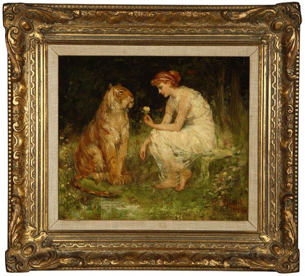 Seated girl presenting a rose to a tiger